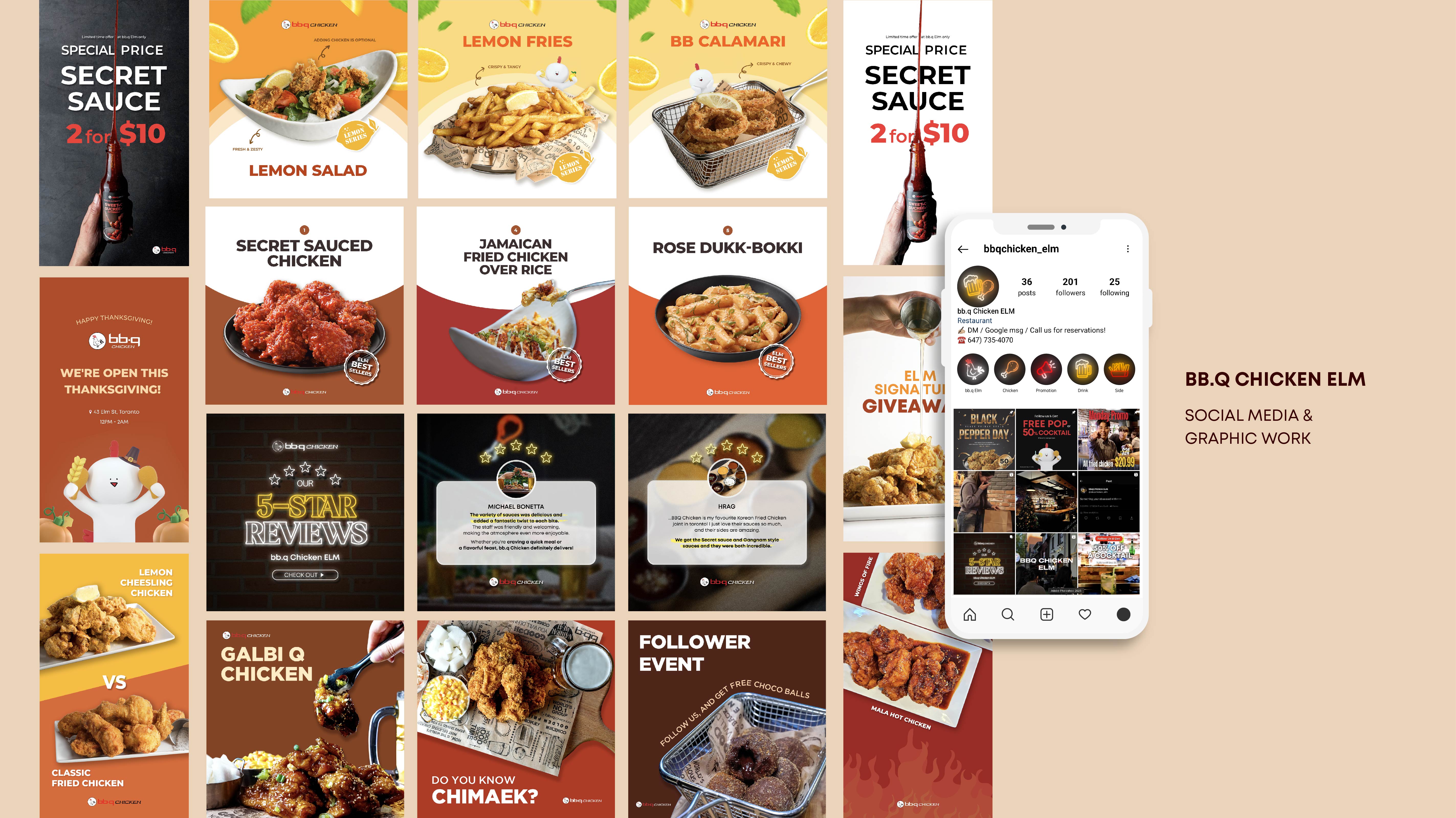 Created unique Instagram concepts and digital visuals for bb.q Chicken Canada, Waterloo, and Elm, enhancing brand identity and driving engagement.